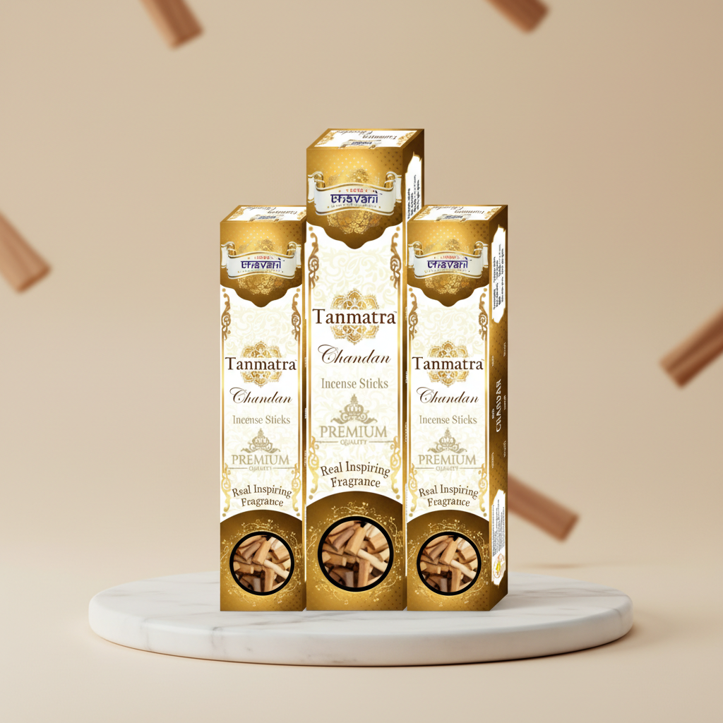 Tanmatra Agarbathi ? Sandal is a premium incense crafted with the rich, earthy essence of pure sandalwood. Its smooth, calming fragrance gently uplifts the senses, creating a serene and harmonious atmosphere. Ideal for daily prayers, meditation, and moments of relaxation, it helps promote inner peace, clarity, and spiritual well-being.